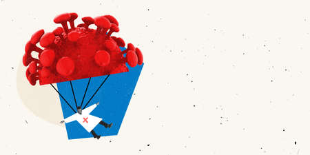 Contemporary art collage. Man, doctor flying on giant red virus cells. Overcoming illness