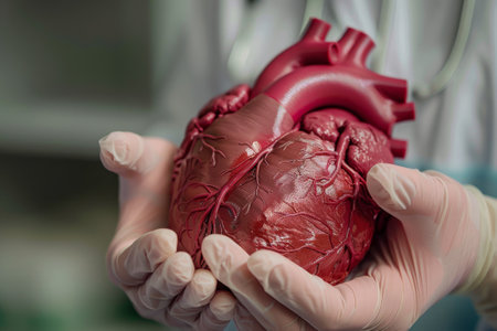 Gloved hands carefully hold a realistic anatomical heart, illustrating the intricate details of human anatomy in a clinical setting.
