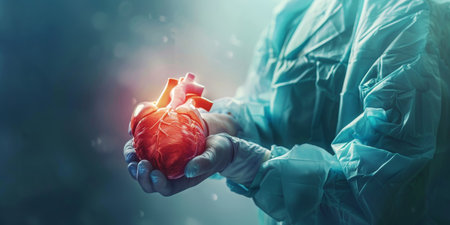 A detailed anatomical heart is cradled gently in gloved hands, highlighting its complex structure and veins under soft lighting.