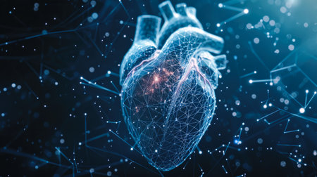 A futuristic 3D rendering of a glowing human heart with digital energy streams, symbolizing advances in cardiology, AI, and medical technology. High quality photo