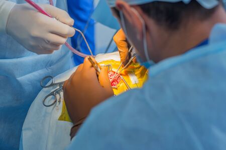 Spinal surgery. Group of surgeons in operating room with surgery equipment. Laminectomy. Modern medical background