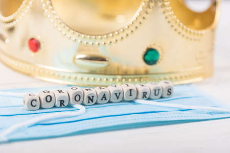 Covid 19, Corona virus text on display in lightbox with crown on it, light background.