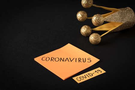 CORONAVIRUS. Sticker with the words coronavirus on a dark background. The concept of protection from viruses. Selective focus.