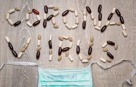 Text phrase Coronavirus on medicine and protective mask. Novel coronavirus 2019-nCoV