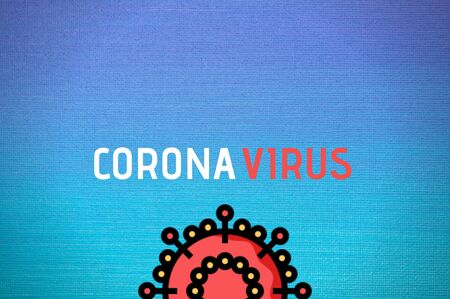 text coronavirus on virus abstract strain model on blue background flat lay. Pandemic Protection Concept. Pathogen organism, infectious micro virology top view. Vertical photo.