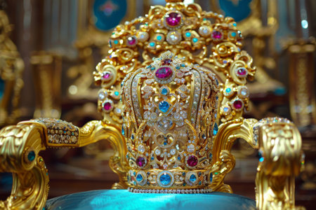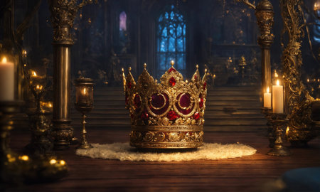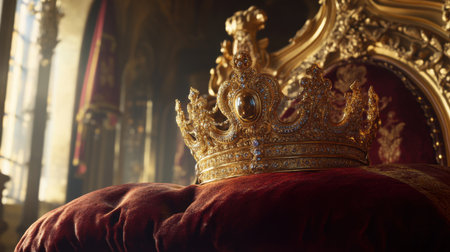 A close-up of a golden crown adorned with jewels, resting on a plush velvet throne in a grand palace. The image evokes feelings of royalty and power.