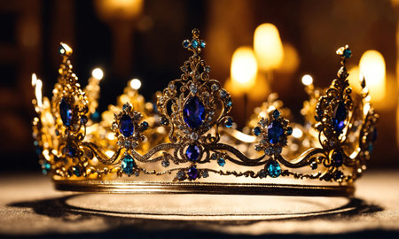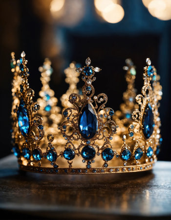 A stunning royal crown rests on an elegant vintage table, surrounded by rich decor and warm light, evoking a sense of luxury and historical significance.