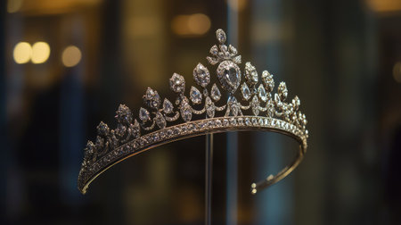 This stunning tiara is showcased within a glass case, illuminated to highlight its intricate design and sparkling details, representing luxury and elegance.