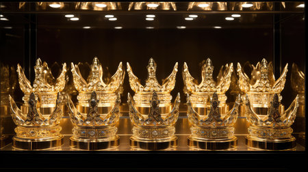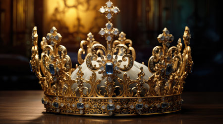 Bedazzled with precious gems, an ornate golden crown embodies the kingdom's renowned prestige. Concept Royal Luxury, Golden Majesty, Precious Gems, Ornate Crown, Kingdom Prestige