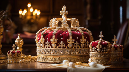 A crown of the united kingdom on ornate design table in the palace. beautiful Generative AI AIG32