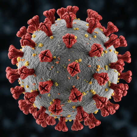 This image depicts a detailed microscopic view of a coronavirus particle. The virus is characterized by its spherical shape and distinctive red spike proteins protruding from its surface. These spike proteins are essential for the virus's ability to attach to and infect host cells. The background is dark, emphasizing the virus's structure and making it stand out clearly.