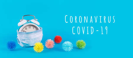 Alarm clock in medical mask and plastic balls aka viruses on the blue background with Coronavirus COVID-19 wording. Epidemic, social isolation, coronavirus COVID-19 concept. Option with text