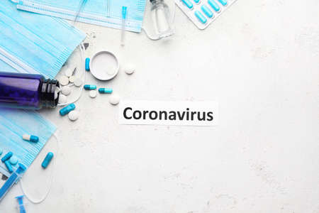 Above view composition of medical masks framing coronavirus word and medication laid out over grey background, copy space
