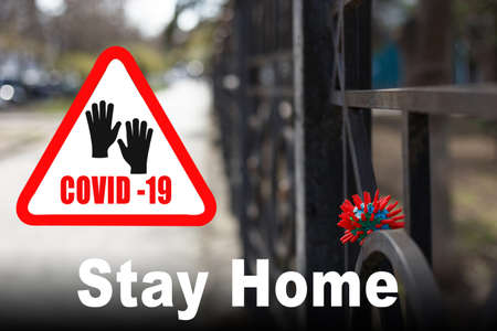 A symbol of the virus Coronavirus Covid -19 of new type placed on a lock of a metal gate, with inscription stay home on pincture.