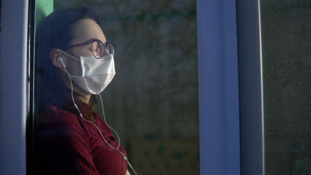 A young woman is sitting at home in quarantine with headphones in her ears. A girl sits on a window sill in a mask and listens to music. View behind the glass.
