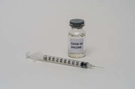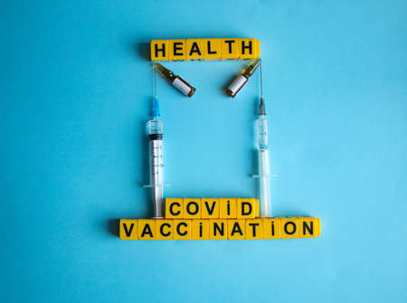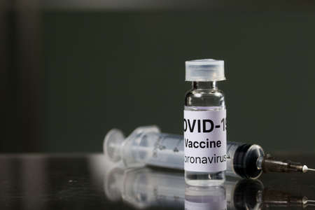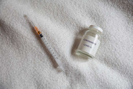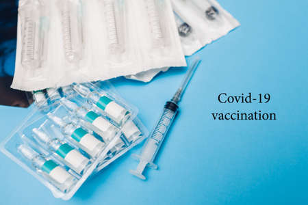Ampoule with covid-19 coronavirus vaccine and syringe for injections