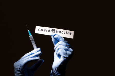 syringe of coronavirus vaccine on a dark background. Disease treatment concept, vaccination against COVID-19.
