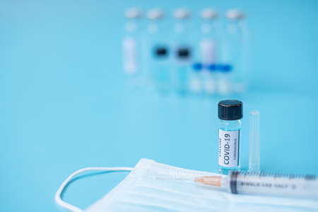 COVID-19 Vaccine vial, injection Needle Syringe and Face mask against Coronavirus infection in hospital laboratory. Medical, health, Vaccination and immunization concept