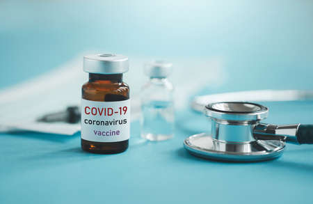 Medical vial with Coronavirus Vaccine COVID-19,, syringe, stethoscope and face mask on blue background with copy space. Vaccination session and immunity improvement