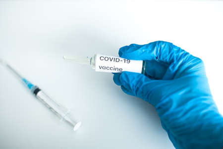 Doctor hand with blue gloves and Covid-19 vaccine