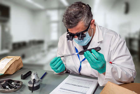 Scientist Police hold murder victim comb to find dna in crime lab, concept image