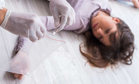 Specialised police open bundle of drugs in crime lab, conceptual image