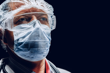 Male doctor wearing protective Mask and Goggles. Dark background.