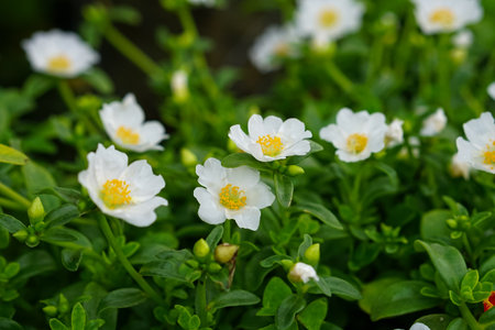 Close-up of blooming white portulaca flowers with yellow centers, surrounded by lush green leaves. Captured in natural light, ideal for tropical garden and nature-themed advertising.