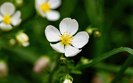 Flower of European water-plantain or Alisma plantago-aquatica close-up, selective focus, shallow DOF.