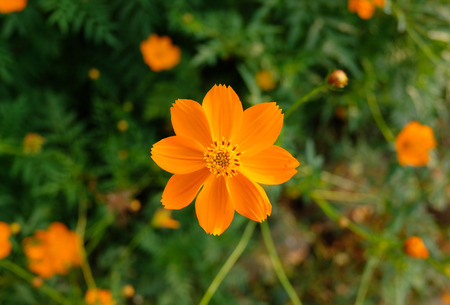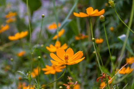 Close up Cosmos sulphureus with buds and green leaves orange summer flowers blooming in beautiful garden landscape