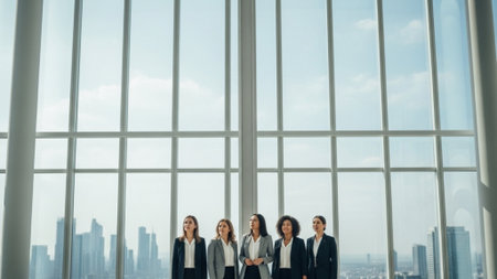 A panoramic, cinematic environmental wide shot of a diverse group of five professional women collabo