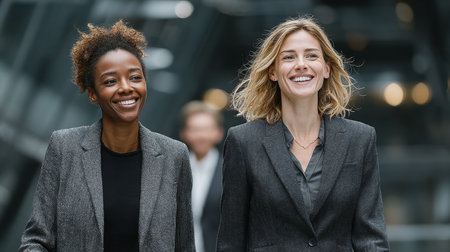 Two confident businesswomen walking outdoors, representing diversity, success, and teamwork.
