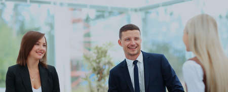 Business team standing in front of the meeting room. Successful company with happy in workers.