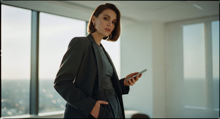 A confident woman in a modern office setting, holding a smartphone, dressed in a stylish suit, with a city skyline visible through large windows