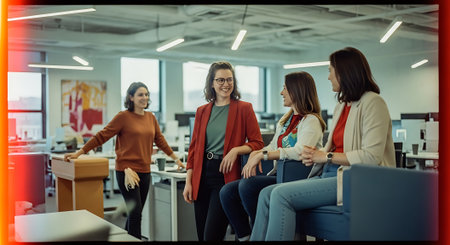 Four women laughing and chatting in a modern office environment together