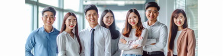 Generative AI : Banner of Group asian employee are standing and looking at camera with feeling confident at workplace company Portait of Asian creative team posing in workspace