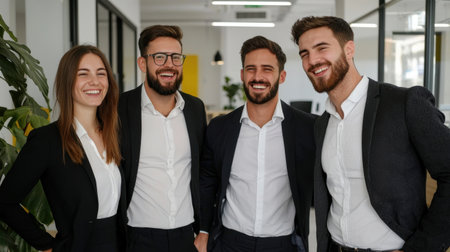 A dynamic group of four professionals share a joyful moment in a stylish office, showcasing teamwork and positive energy. Ideal for business themes.