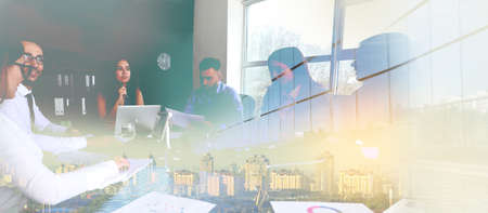 Double exposure of colleagues at business meeting and modern city. Concept of business consulting