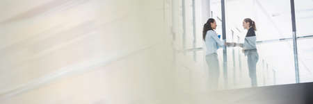 Two caucasian women having an handshake in front of to colleagues. with office background concept. digitally generated image.