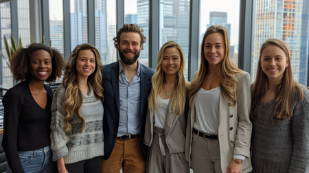 Diverse group of people in office, smiling at camera, wearing casual clothes, wide angle, city view windows