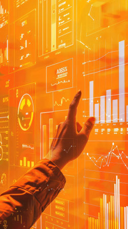 Illustrate a scene where a hand taps on an orange digital screen that morphs into technological tools , Generate ai