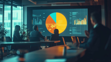 A modern office workspace with a large financial pie chart projected on a screen, with business professionals discussing and analyzing the data in the foreground.