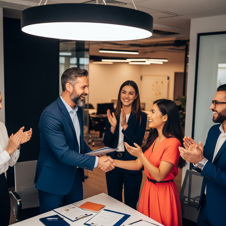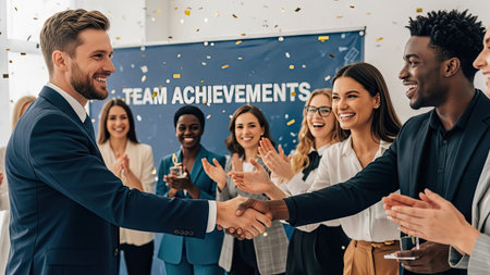 A diverse group of professionals are captured celebrating a team success, highlighted by a handshake and applause. The composition emphasizes a dynamic moment of camaraderie with a banner in the background. The scene suggests an indoor corporate setting with a focus on teamwork. The image is suitable for use in business and editorial contexts.