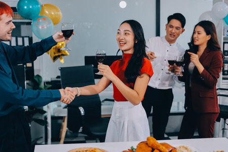 Cheerful office workers are raising champagne glasses during a celebratory event, surrounded by gold confetti and decor, ideal for advertising and corporate themes.