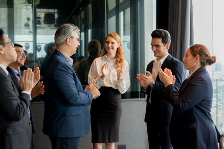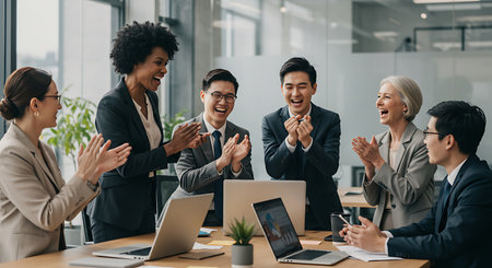 Group of happy business people clapping at meeting in office. Multiethnic group of business people in formal wear celebrating success at work.