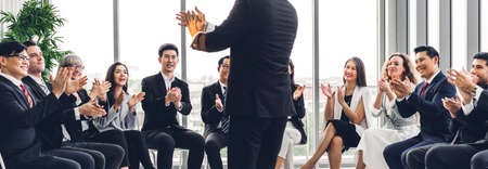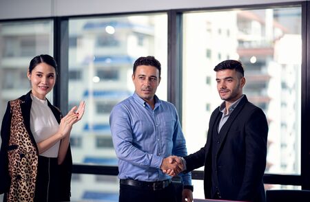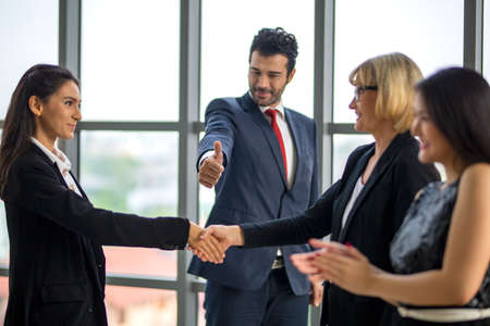Business people shaking hands on meeting in conference room, applause of happy team of office colleague in support of deal. Handshake of professional manager and businessman. Success agreement concept