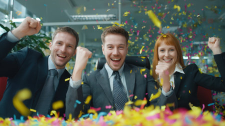 Celebrating teamwork and success, three professionals express joy in vibrant office filled with colorful confetti. Their smiles and raised fists convey excitement and achievement