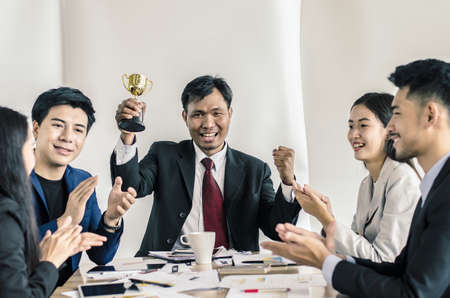 Businessman clapping hands with trophy, reward, winner, champion and successful for business