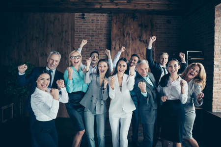 Close up photo yelling diversity different age multiethnic mixed race business people stand she her he him his best brigade hands arms raised up project got first place formalwear jackets shirts