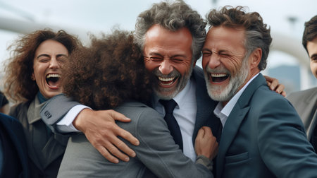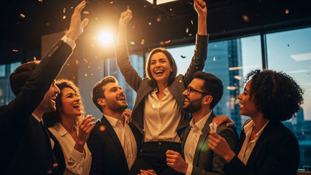 A diverse group of professionals celebrate a success in a modern office. The image depicts individuals dressed in business attire, some raising their arms in triumph. The composition is well-lit, with a warm color palette. This image could be used for articles, advertising, or promotional materials.